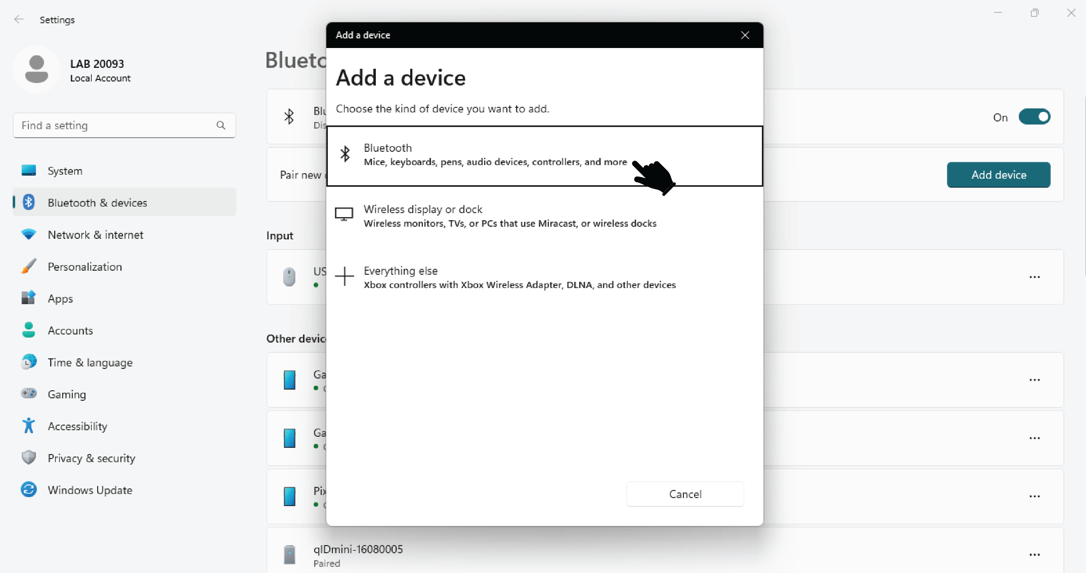 1. Turn on the Bluetooth of the PC. Go to Bluetooth & Devices and click on Add Device as shown in the image below.