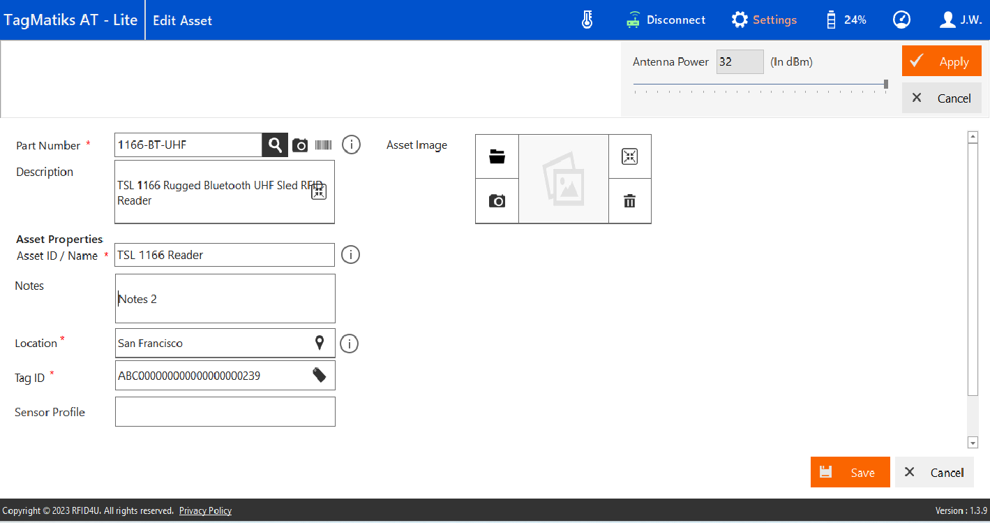 2. Enter all the asset details. As the reader is already connected, click on the Settings Icon to decrease the antenna power of the reader and click on Apply as shown in the image below.