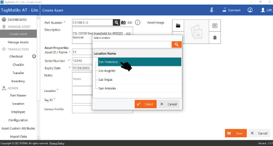 10. Select the location from the searchable dropdown of your created locations. This is the initial location where the asset is located.