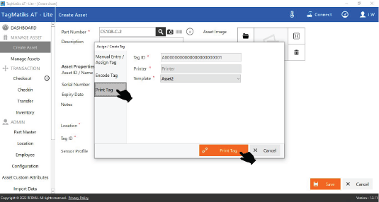17. If you do enable the Print Tag option, the next Tag ID for the EPC value will also be displayed automatically in the Tag ID field. In addition, you’ll be able to choose the Printer and Template you’d like to use to print. You’ll need to have a printer and template setup before doing this step. Press the Print Tag option to print the RFID tag.