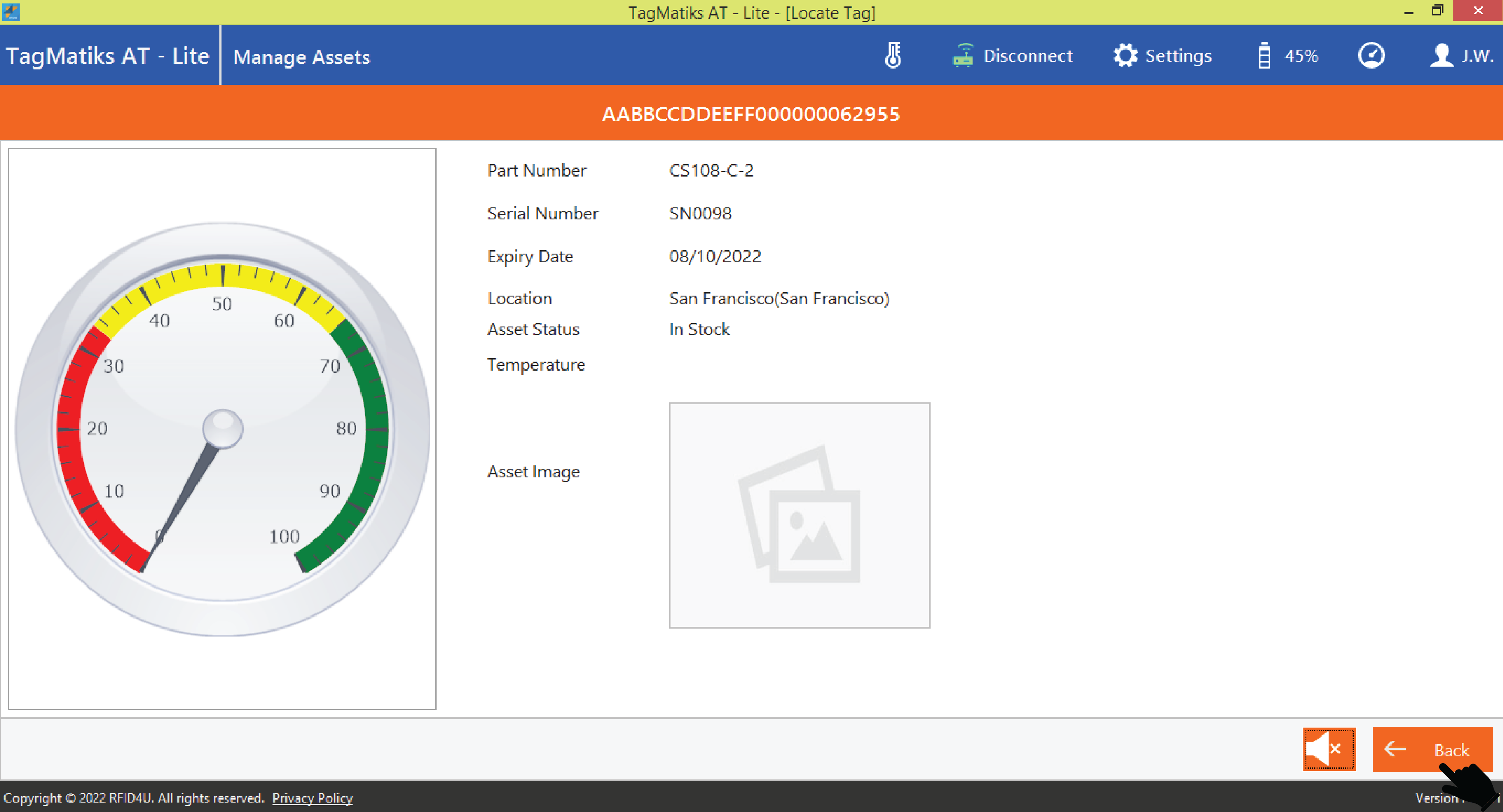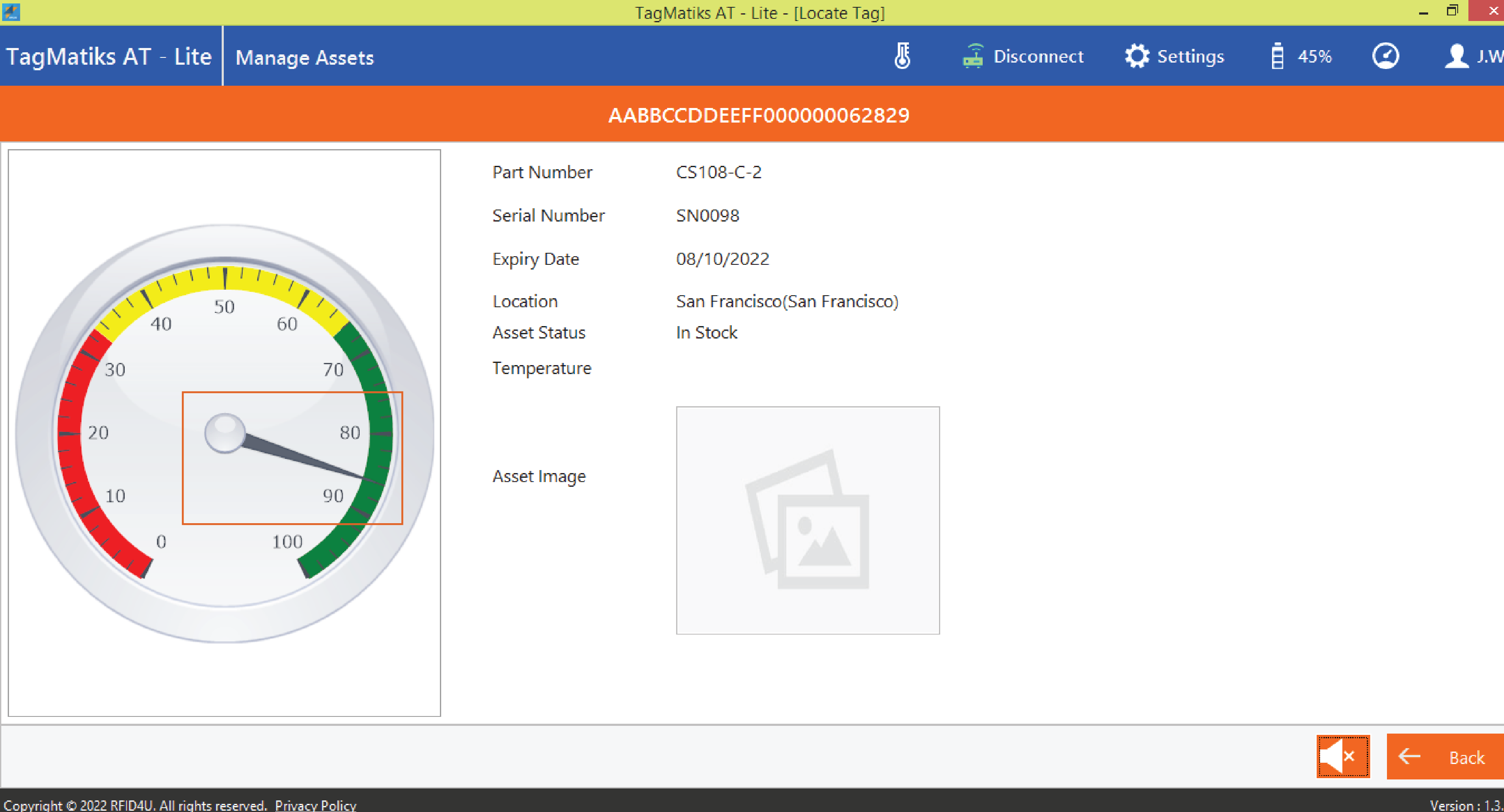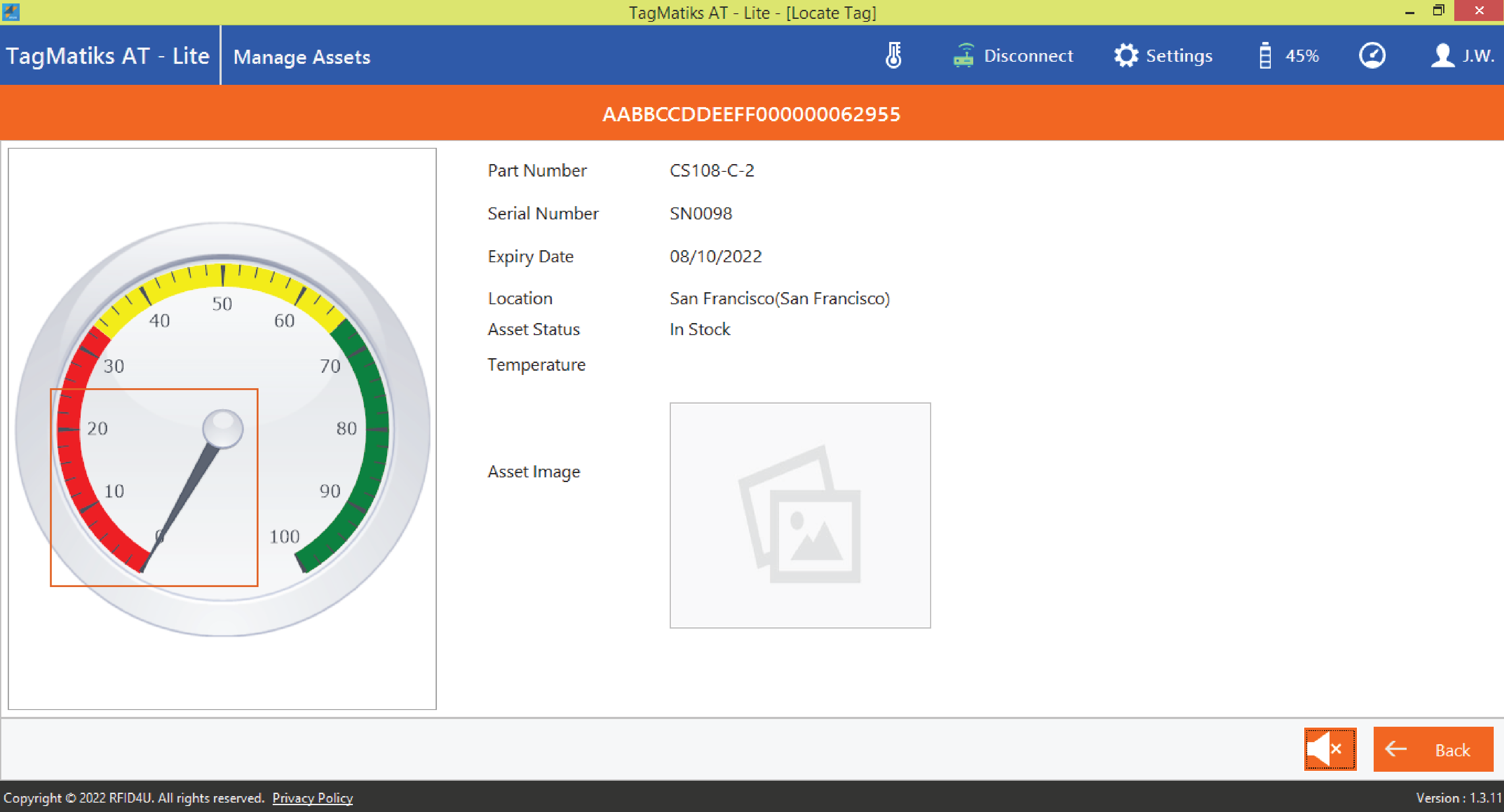 6. As you get closer to the RFID tagged asset, the gauge will go up, if you get further away, it will go down. You can also mute/ unmute an audio feature to get audio feedback as well
