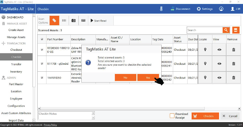 4. A popup will open I which total scanned asset and total selected asset will populate, if you are sure to do check in transaction click on the “Yes” button as shown in image below.