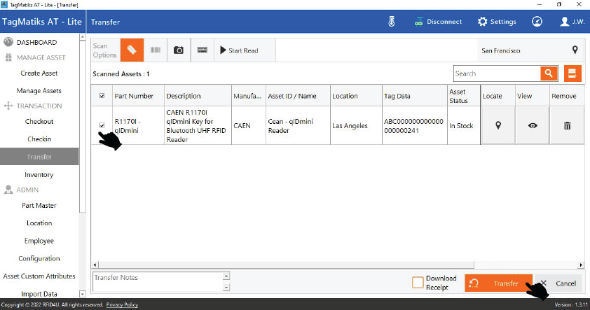 5. Click on checkbox to select the required asset to check in and then click on “Transfer” button from bottom right-hand side of application as shown in image below.