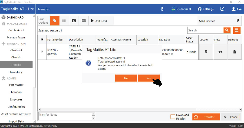 6. A popup window will open in which Total scanned asset and Total selected asset will populate. If you are sure you want to transfer the asset, click on Yes as shown in image below.
