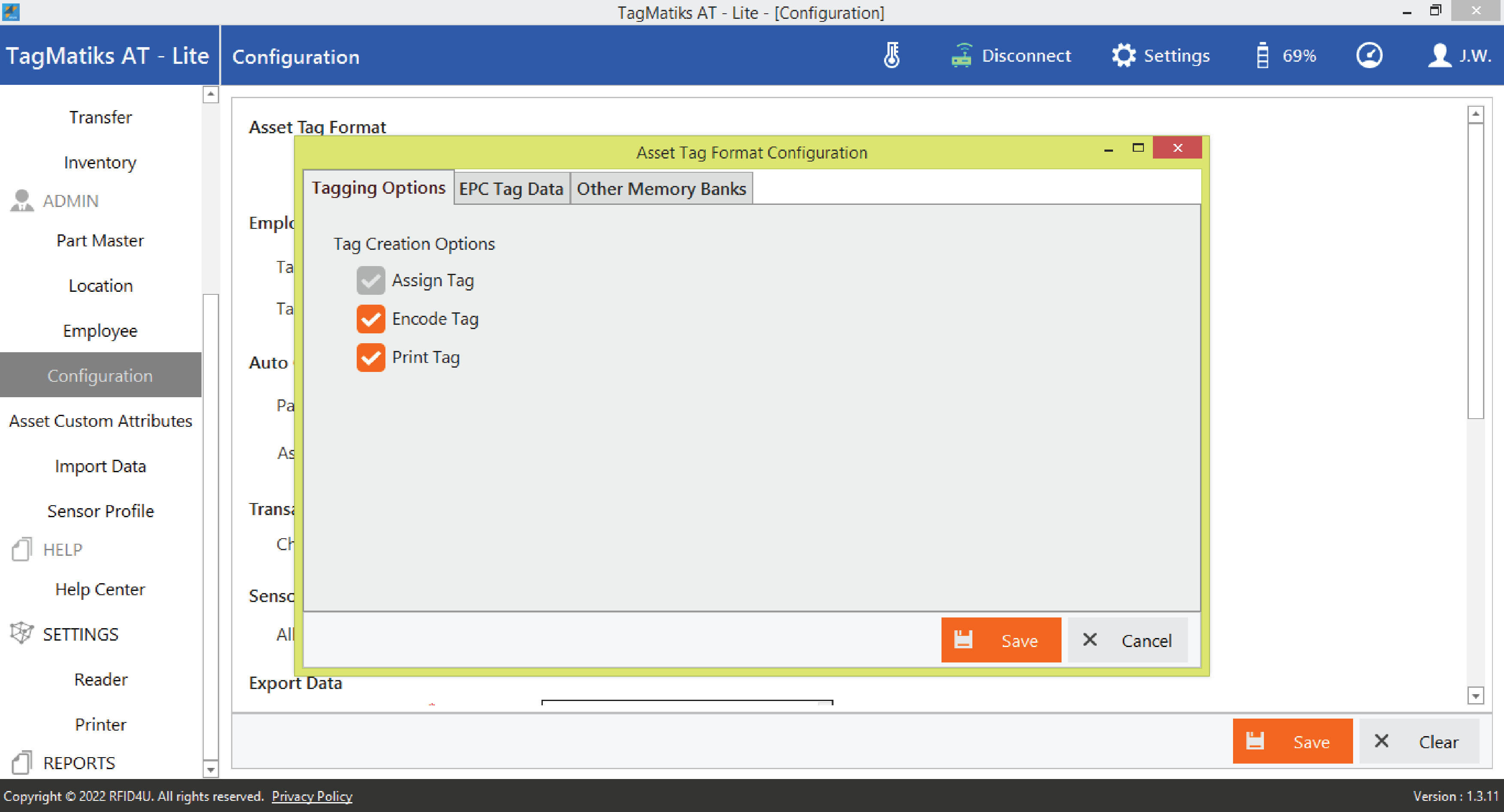 4. To access the Asset Tag Format Configurations, click on the “Asset Tag Format Configuration” button. On this page, you will see tabs for Tagging Options, EPC Data and Other Memory Banks.