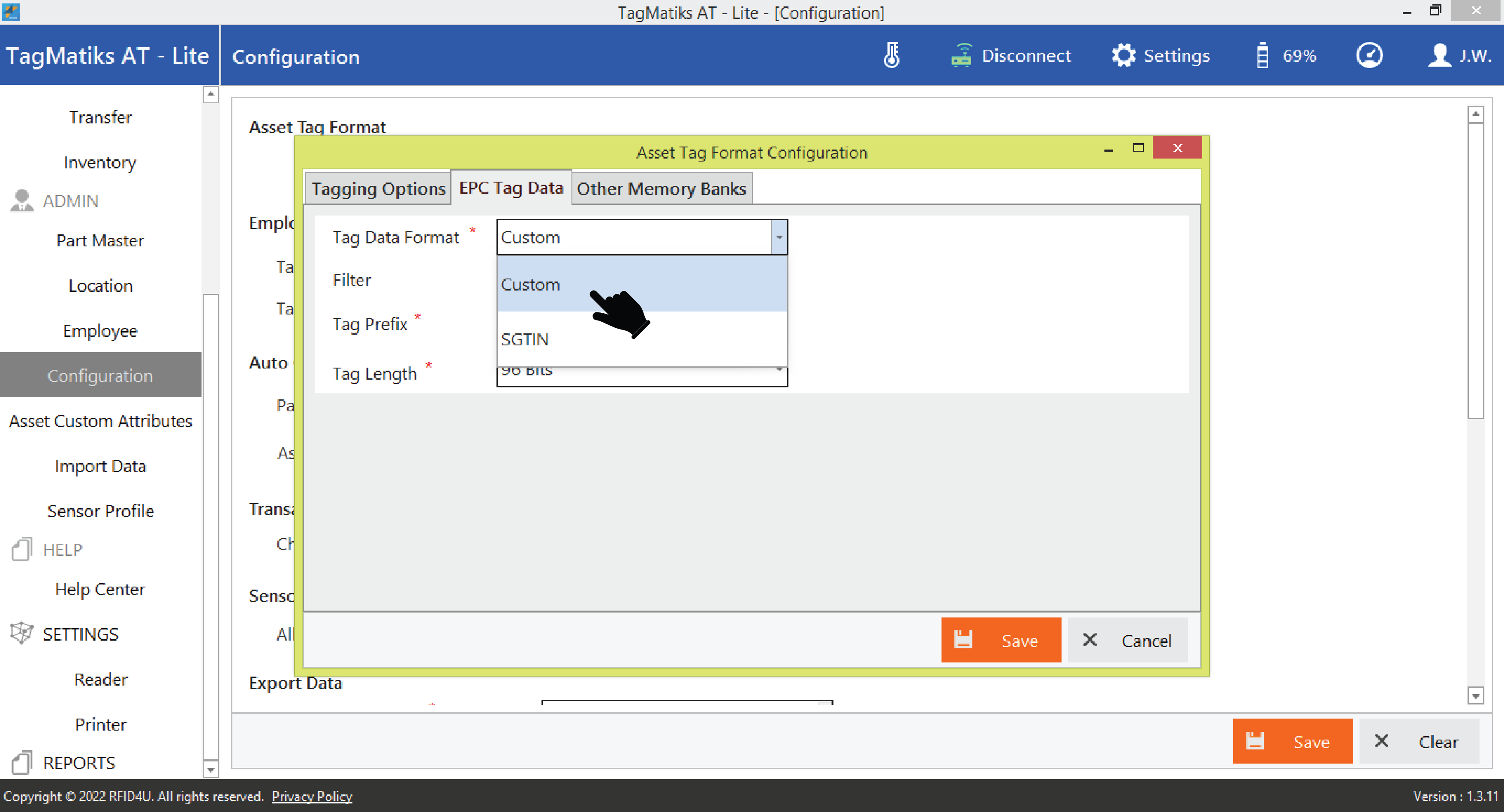 8. You can choose the following options - Tag Data Format: Either choose a custom schema where you can define your own encoding rules or use the SGTIN format.