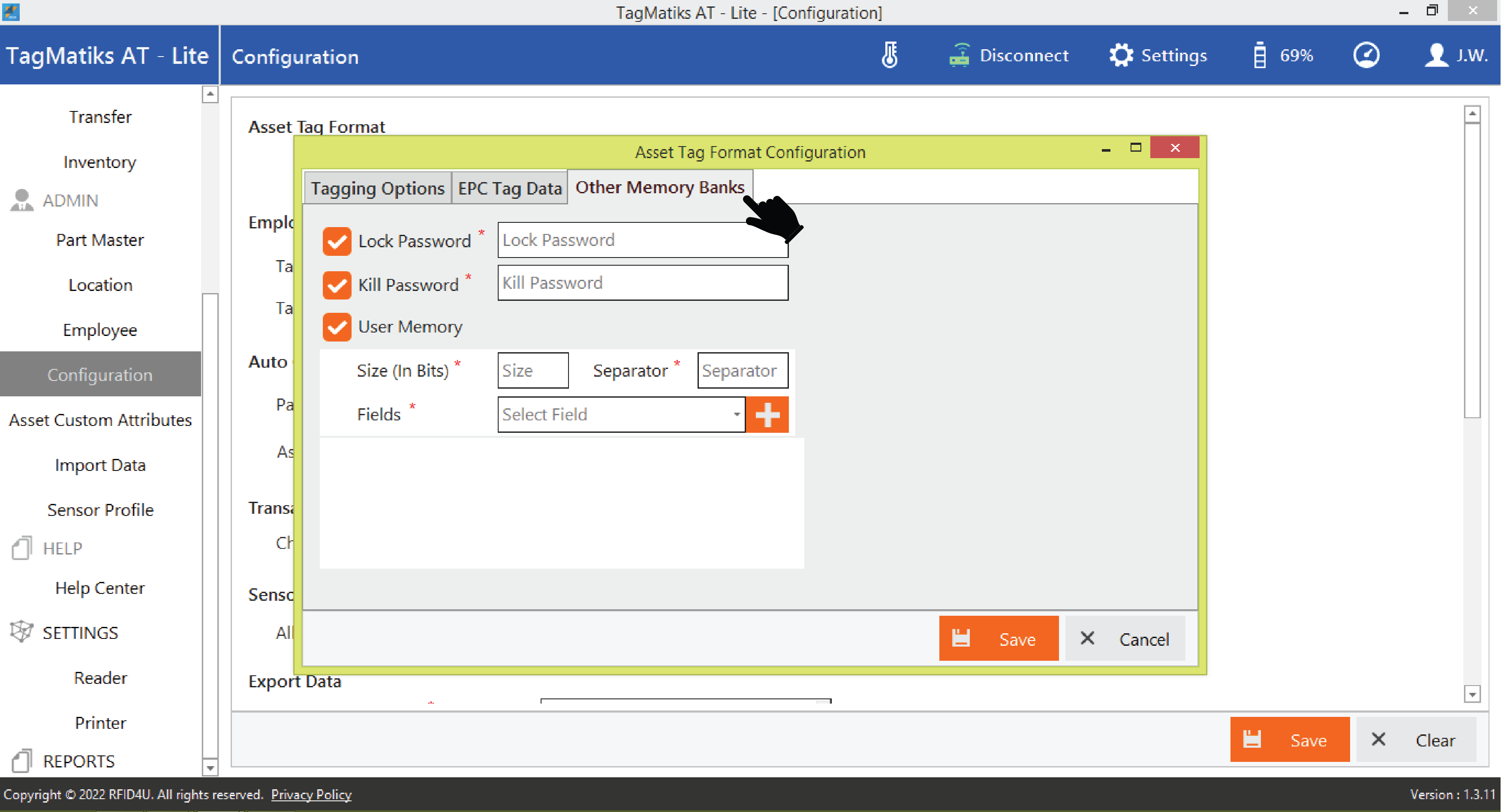 9. The Other Memory Banks tab lets you enable the banks for the lock password, kill password as well as the user memory bank. By default, they are disabled.