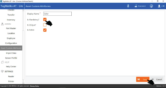 4. A new page will open, enter the Asset custom attributes name and click on the “Is Mandatory, Is Unique and Is active “ check box as per your requirements.