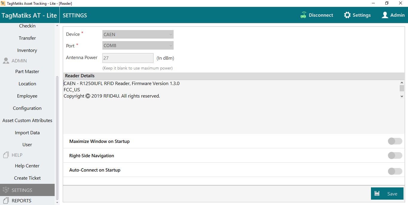 Open TagMatiks Asset Tracking Lite Software and enter the settings menu.
