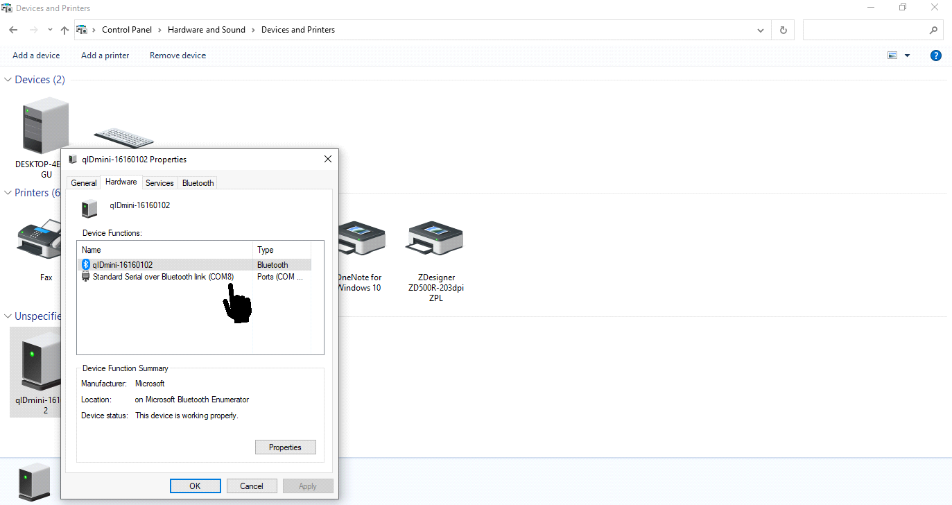 1. In control panel right click on the paired device with Bluetooth, listed in Unspecified and click on hardware