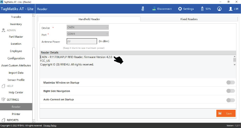 6. Reader details will appear with the Firmware version as shown in image below.