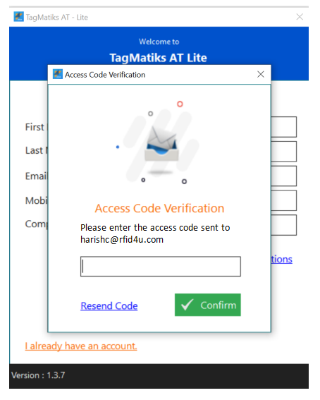 After you do this, you will receive an email with a access code. Enter the access code into TagMatiks AT Lite and then set your desired password.