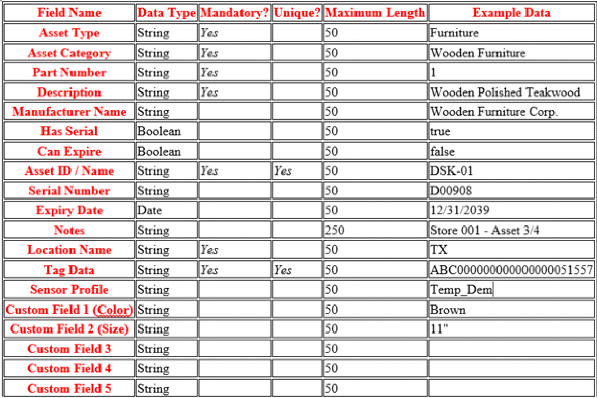There are certain rules of formatting of the asset data that must be followed, please follow the data formatting as mentioned in below charts.