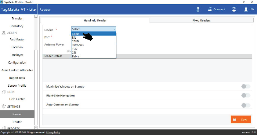 5. To make the connection with CSL reader; click on “dropdown to select Device”; as shown below.