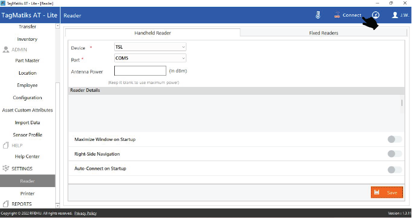 2. On the top right side of the application, you can check the reader’s connection status; as shown below. If it is not connected with any RFID reader; it will show as “Connect”. Refer the image below.