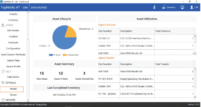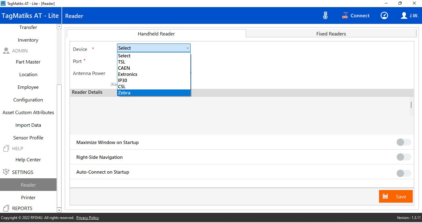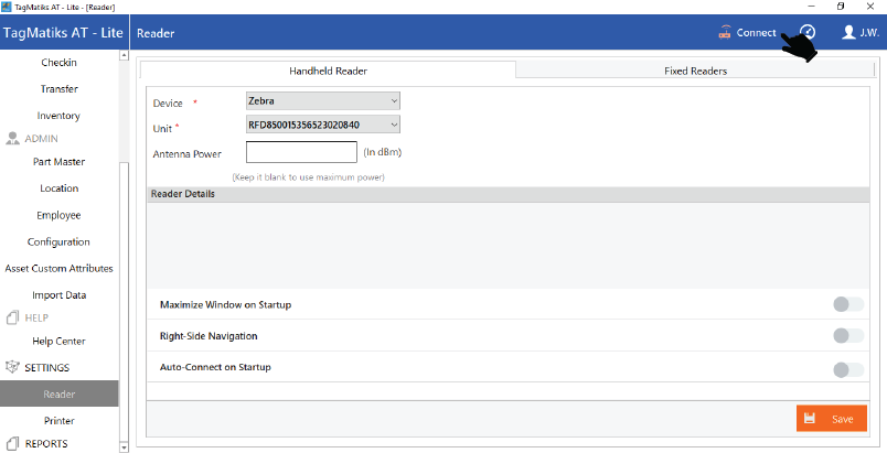 2. To make the connection with the RFD8500 reader, click on the “Reader” button.
