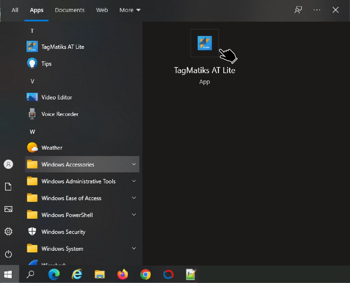 After successful installation of TagMatiks AT Lite application, please open the Start menu and click on the “TagMatiks AT Lite” icon. Refer the image below: