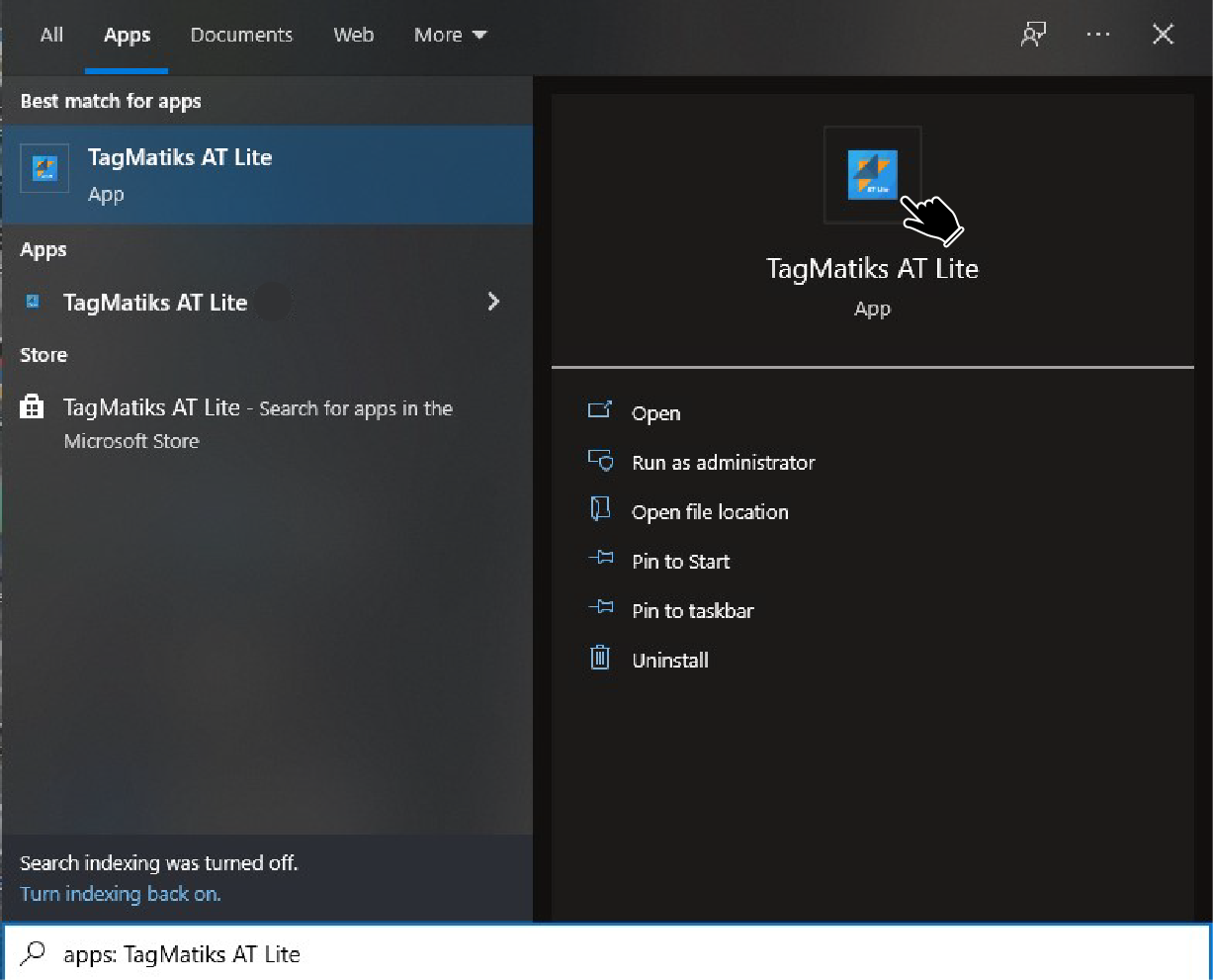OR you can type “TagMatiks AT Lite” in search bar, then the application icon will come up and please click on this icon as shown in below image: